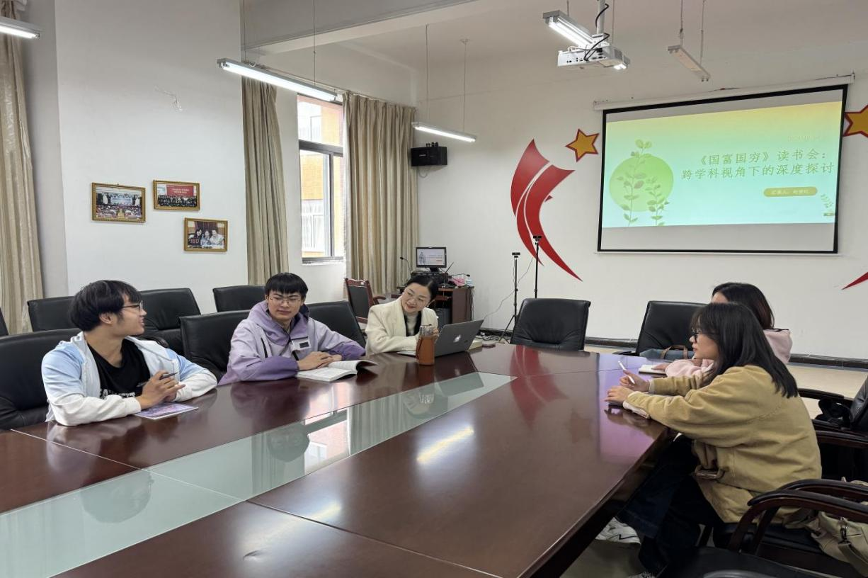 2025年10月23日下午,外语开元(中国)在励学楼301会议室举办《国富国穷》“读书沙龙”活动。本次活动特邀经济开元(中国)赵俊红老师主持,以戴维·S·兰德斯教授的这部经典著作为核心,聚焦“国家命运沉浮背后的深层逻辑”,吸引了来自不同专业的同学踊跃参与,现场氛围热烈。