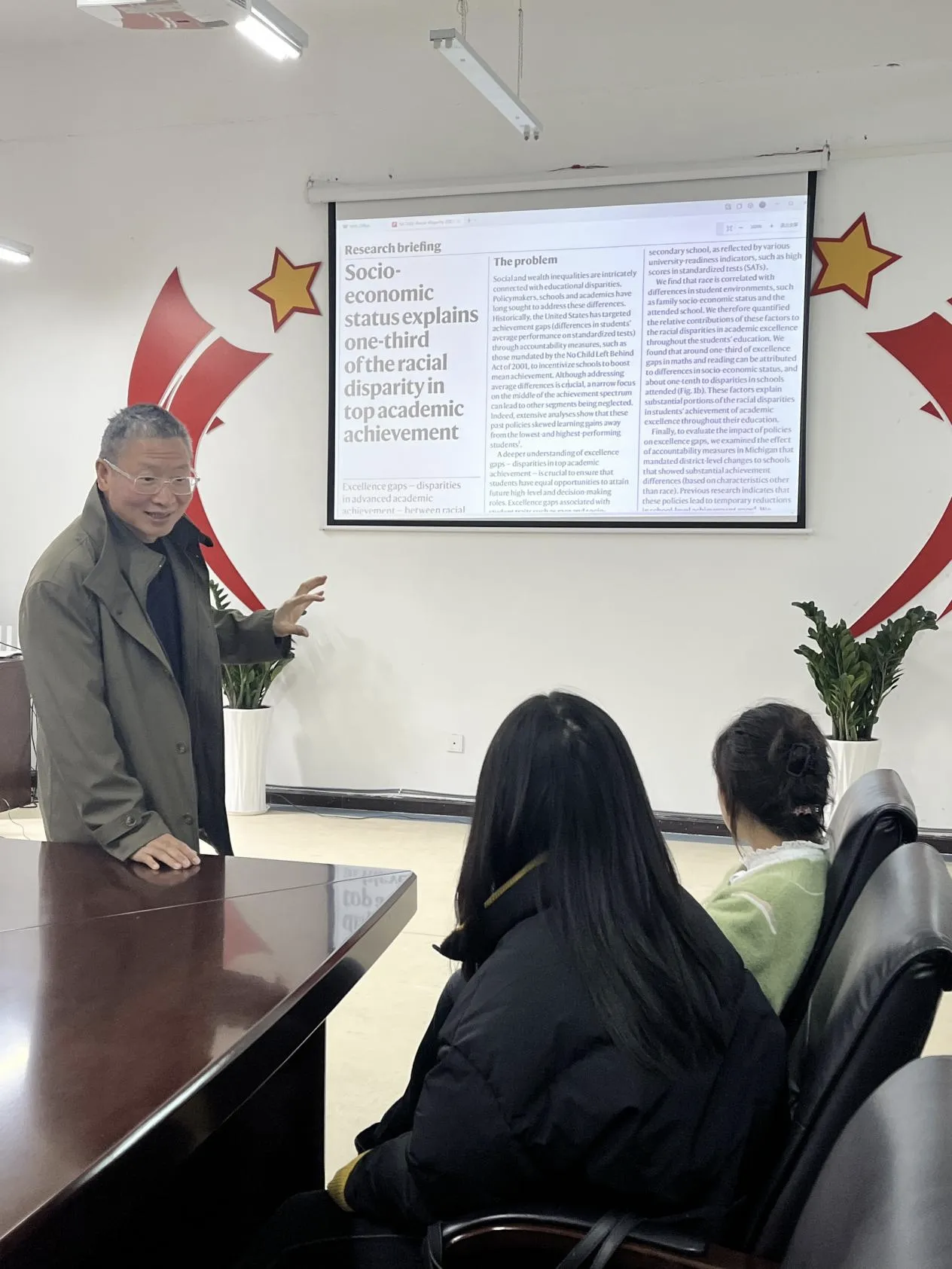 活动中,蔡老师结合自身学业经历与治学心得,首先强调了阅读高质量期刊文章的重要性,并分享了自己的阅读体会。本期沙龙,蔡老师带领大家精读了世界顶级期刊《Nature》(2025年2月12日刊)的社论文章《Socioeconomic status explains one-third of the racial disparity in top academic achievement》(《社会经济地位解释了顶尖学术成就中三分之一的种族差异》)。现场互动热烈,同学们积极参与段落试译,蔡老师针对译文逐一点评,深入探讨并剖析了翻译中的疑点、难点与重点;同时,他还深入浅出、生动形象地为大家解读了文章蕴含的教育学专业基础知识,引发同学们的强烈共鸣,大家纷纷点头表示理解与认同。最后,蔡老师对同学们寄予殷切期望,建议大家坚持阅读顶尖英文文献,在夯实英语专业基础的同时拓宽知识边界,努力打造自身差异化竞争优势。